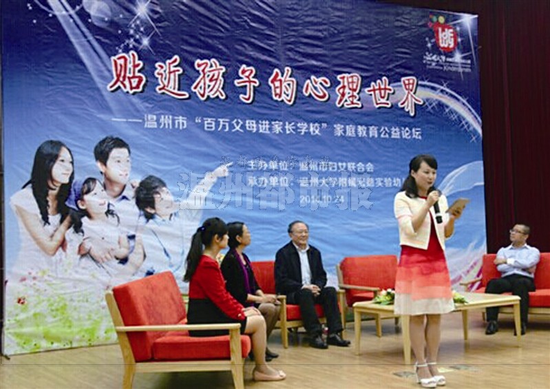 近日,由温州市妇联主办、beat365官方网站附属宏德实验幼儿园承办的“贴近孩子的心理世界”暨温州市“百万父母进家长学校”家庭教育公益论坛在beat365官方网站举行。华东师范大学心理学博导王振宇教授、beat365官方网站教师教育学院林炎琴副教授,以及三位家长参与了论坛对话。宏德实验幼儿园的300多名幼儿家长及教师参与了活动。