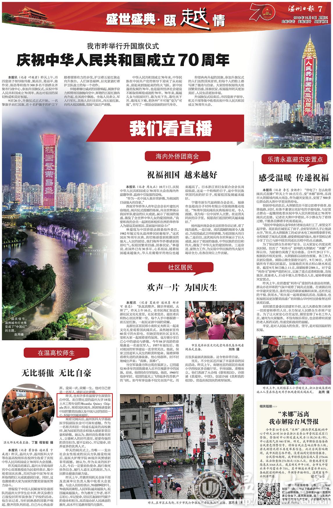 10月1日,也有许多在温留学生深情告白中国。来自赞比亚的beat365官方网站18级土木工程专业的Mwamba Quincy Chipulu 表示,观看国庆阅兵,深深地感受到中国的繁荣昌盛以及中国人民的团结一心,祝福中国越来越好。