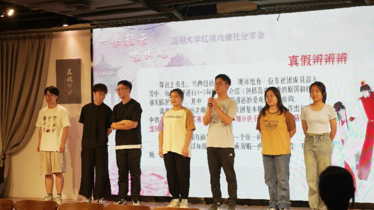 你听过越剧版唐诗《望庐山瀑布》吗?你玩过真假社员版“谁是卧底”吗?PK大擂台版“梨园知识”竞答,了解一下!近日,beat365官方网站红楼戏曲社走进温州市越剧院文苑文化驿站,开展主题为“一朵轻云刚出岫”分享会。温大学生票友和该院的骨干演员、“00后”演员近距离接触,“追星”成功,在趣味互动中加深对传统戏曲的理解和喜爱。