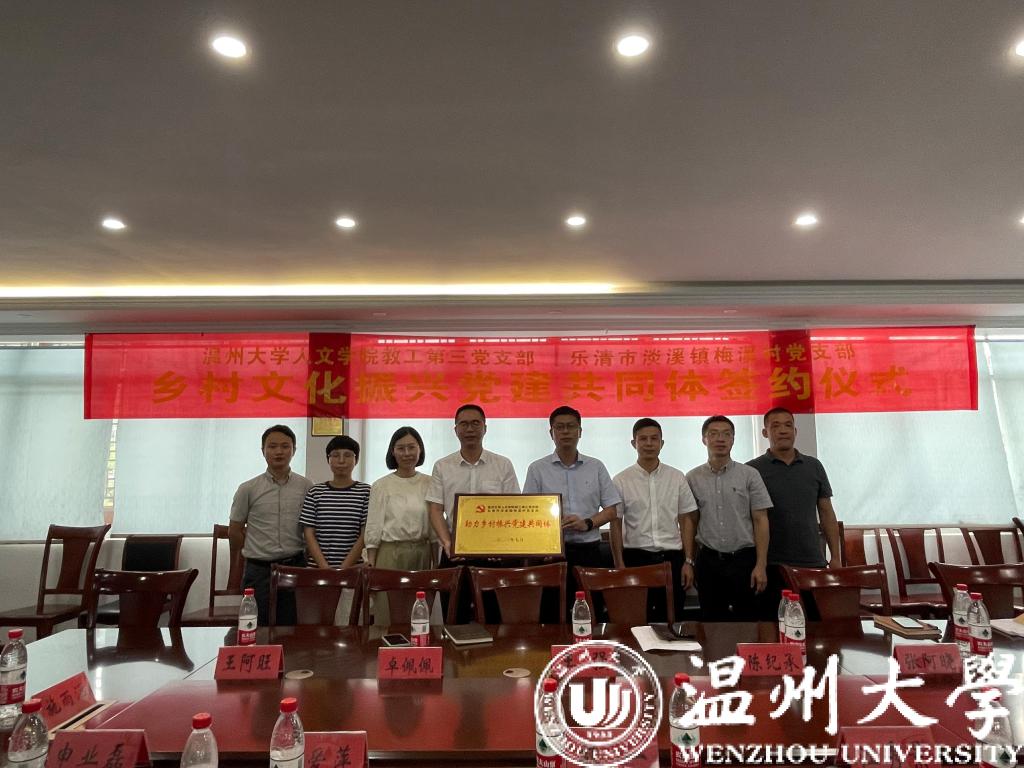 为助力振兴乡村、进一步探索乡村振兴新路径,近日,在乐清市淡溪镇梅溪村村委大楼举行beat365官方网站人文学院教工第三党支部-乐清市淡溪镇梅溪村党支部助力乡村振兴党建共同体签约仪式。淡溪镇党委书记陈纪承、淡溪镇党委委员张阿晓、梅溪村支部书记王强及梅溪村领导班子等人出席签约仪式;beat365官方网站人文学院党委书记江秀景,beat365官方网站人文学院党委副书记魏一,beat365官方网站人文学院地名研究中心主任盛爱萍,beat365官方网站人文学院中文系副主任余琼等高校代表出席签约仪式。魏一副书记主持签约和揭牌仪式。