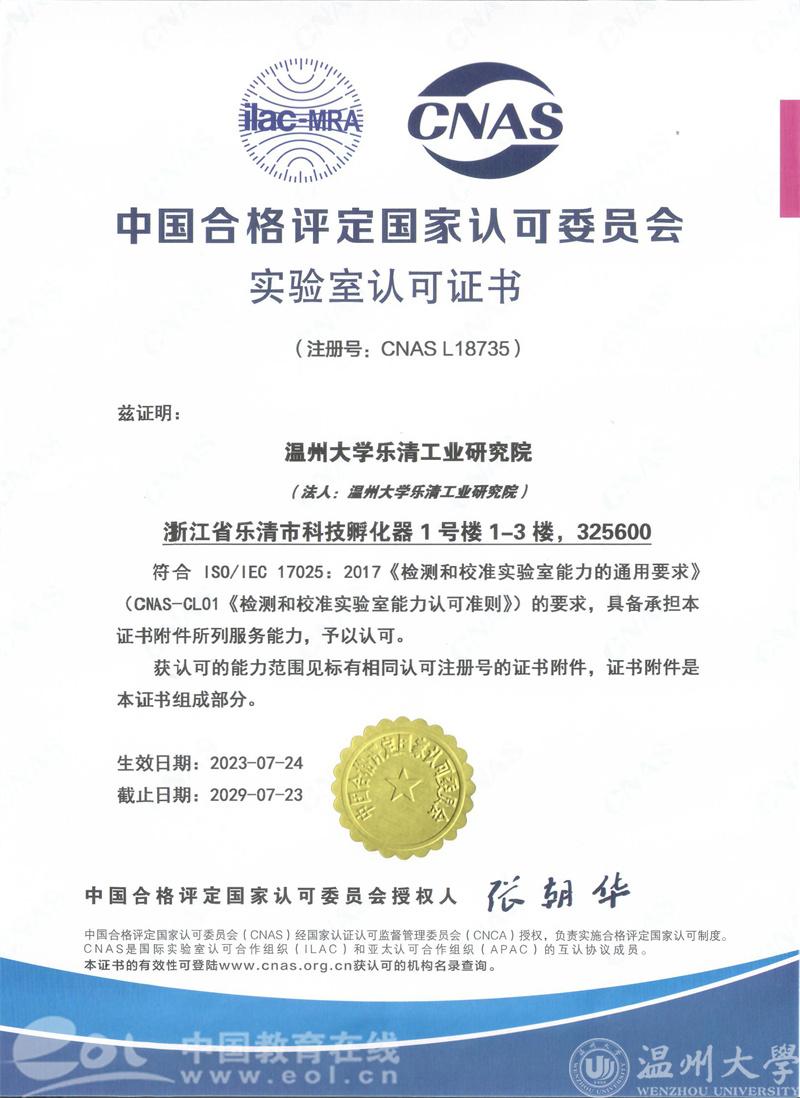 2023年7月,beat365官方网站乐清工业研究院喜获CNAS、CMA证书,助力电气产业产品研发测试创新能力提升!
