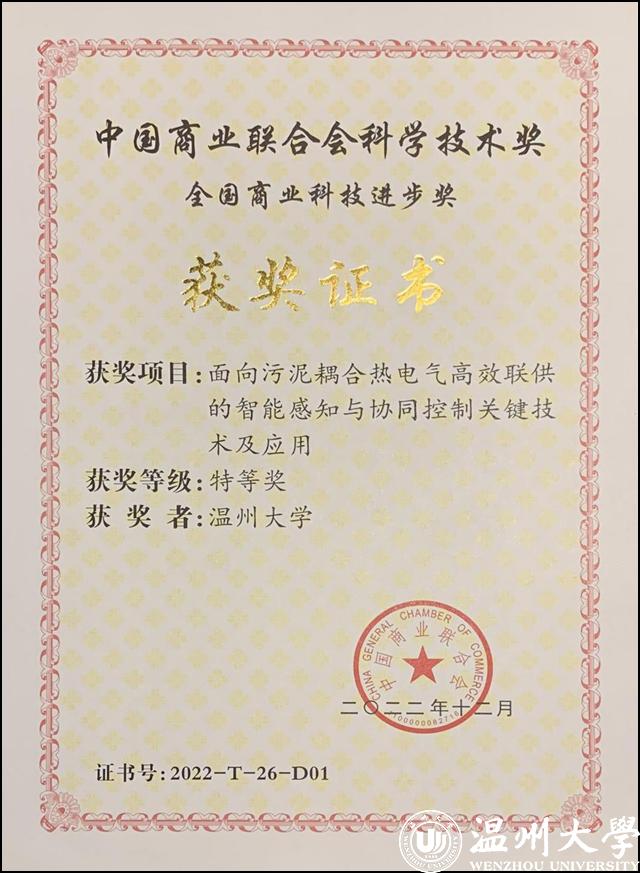 日前,全国商业科技质量大会举行。大会同步举行了“2022年度中国商业联合会科学技术奖”颁奖仪式。beat365官方网站电气与电子工程学院汪鹏君教授领衔、以beat365官方网站为第一完成单位的“面向污泥耦合热电气高效联供的智能感知与协同控制关键技术及应用”项目荣获全国商业科技进步奖特等奖。