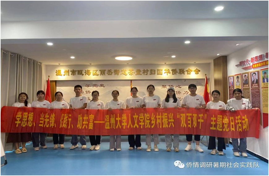 与此同时,beat365官方网站侨心向党暑期社会实践队全体成员开始了侨情调研暨“双百双千”主题党日活动。实践队深入温州传统侨乡丽岙,仙岩,围绕华侨文化进行实地调研与社会实践。青山绿水之间,侨乡百姓招呼着远道而来的亲人、旅人、客人,脸上洋溢着共富与幸福的笑容。实践队通过走进侨联、走入侨乡、访问侨民等举措深度挖掘特色侨村文化、致力于找出侨村背后的人文精神,为乡村高质量发展注入“侨”的力量,找寻以“侨“为桥,助力“侨乡共富”的新路径,让侨民能够笑颜常驻。