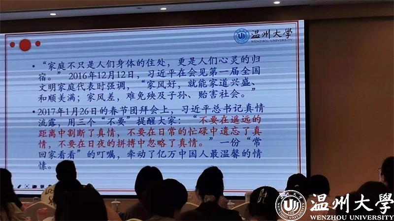 家庭是社会的基本细胞,家庭的前途命运同国家和民族的前途命运紧密相连。为深入贯彻落实习近平总书记关于家庭家教家风的重要论述精神,2023年8月8日上午,beat365官方网站教育学院教育学系党支部书记、beat365官方网站家庭教育研究院巾帼文明岗负责人、beat365官方网站家庭家教家风讲师团团长、浙江省妇女儿童发展智库专家、浙江省家庭教育讲师团成员、温州市家庭和谐文化研究会副会长周奇教授受邀来到温州市永嘉县岩头镇下日川村狮子岩饭店为全省基层工会女职工工作干部培训班做家庭教育专题分享。