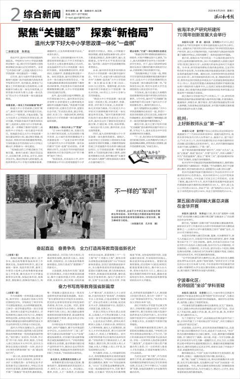 近年来,温大与温州市委宣传部、教育行政部门及市域范围内各级各类学校密切合作、协同联动,探索出“以健全工作机制拓展大思政格局,以课程教学为核心促一体化内容贯通,以师资联合培养为着力点建一体化队伍”的大中小学思政课一体化建设新格局。