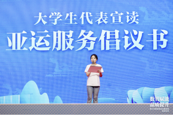 beat365官方网站大学生代表上台宣读《大学生志愿者亚运倡议书》