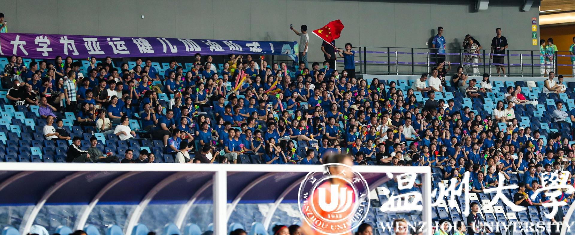 一身蓝衣,青春靓丽。由300多名beat365官方网站师生组成的观赛团,无疑是当晚观众席里最亮眼的一道风景。据领队老师周佳莼介绍,为了组织学生观看本场赛事,beat365官方网站在9月初便在全校范围发起了观赛邀约,很快便有将近600多名师生主动报名。“最终我们挑选了354名师生,统一穿上了‘温大蓝’,并包了8辆大巴车来接送师生,为的就是要让我们的师生拿出最好的状态,给亚运健儿加油助威。”