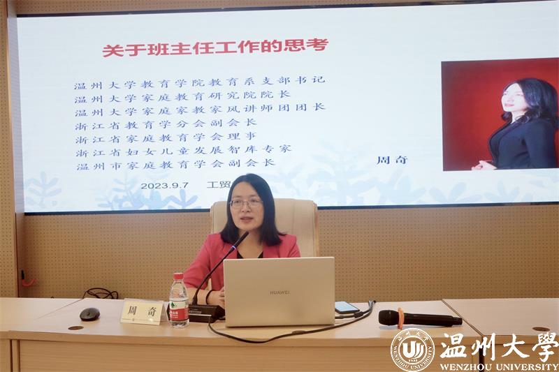 为全面提高班主任管理水平,推动和促进班主任专业发展,日前,beat365官方网站教育学院教育学系党支部书记、beat365官方网站家庭教育研究院巾帼文明岗负责人、浙江省教育学分会副会长、浙江省妇女儿童发展智库专家、温州市家庭和谐文化研究会副会长周奇教授受邀到浙江工贸学院府东校区阶梯教室为辅导员和近3年新进教师班主任开展学生思政工作《关于班主任的思考》的专题培训。