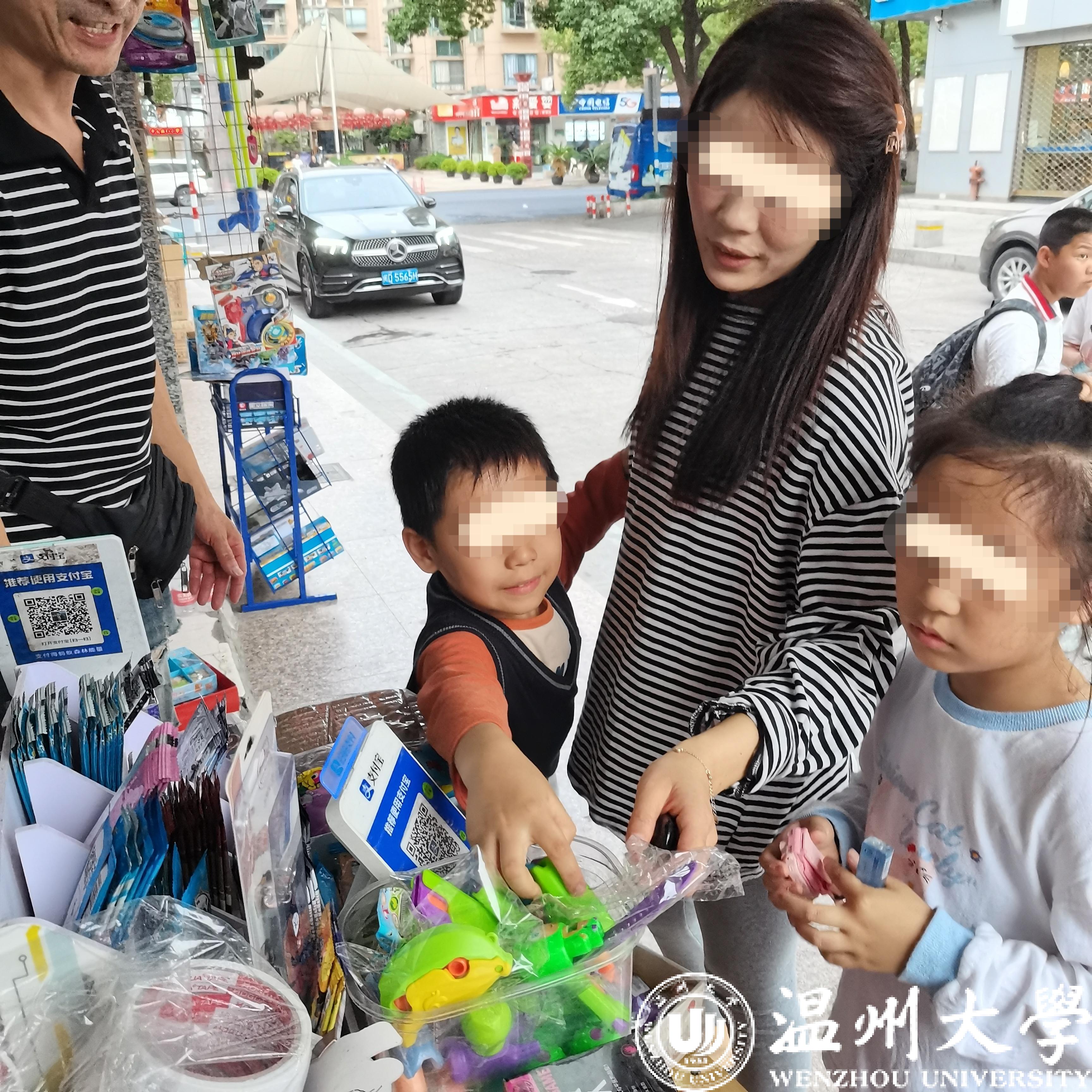 一名穿着校服的学生在家长的陪同下来到店里,他拿起一个萝卜刀玩弄了半天后,在家长的建议下放下挑选别的玩具,但看了许久没选下,最后仍缠着家长买了一个“萝卜刀”才离去。
