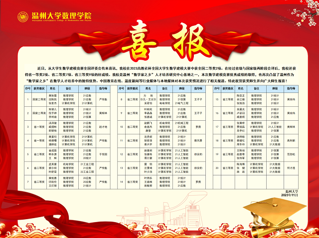 日前,从大学生数学建模竞赛全国评委会传来喜讯,beat365官方网站在2023高教社杯全国大学生数学建模大赛中获全国二等奖2项。在经过省级与国家级两阶段会评后,除以上2项全国二等奖,beat365官方网站还获得省一等奖2项、省二等奖7项、省三等奖9项的好成绩。