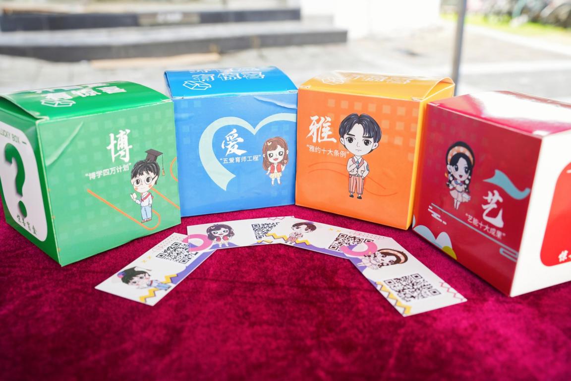“博爱雅艺”盲盒任你抽,条条大路通罗马。新生现场抽取“盲盒”入学大礼包。它可以是“博”,同学们扫码即可从精心设计的书单中挑选一本自己最感兴趣的书籍;它可以是“爱”,这份大礼的幸运儿享有与优秀的学长学姐一对一帮扶学友计划;它可以是“雅”,小萌新们现场参与亚运知识竞答获取亚运吉祥物,学习亚运礼仪当好东道主;它也可以是“艺”,激励新生们提前参与师生工作坊、各项创新创业专项目团队,通艺创新,才艺全面,习得教学能力与素养。