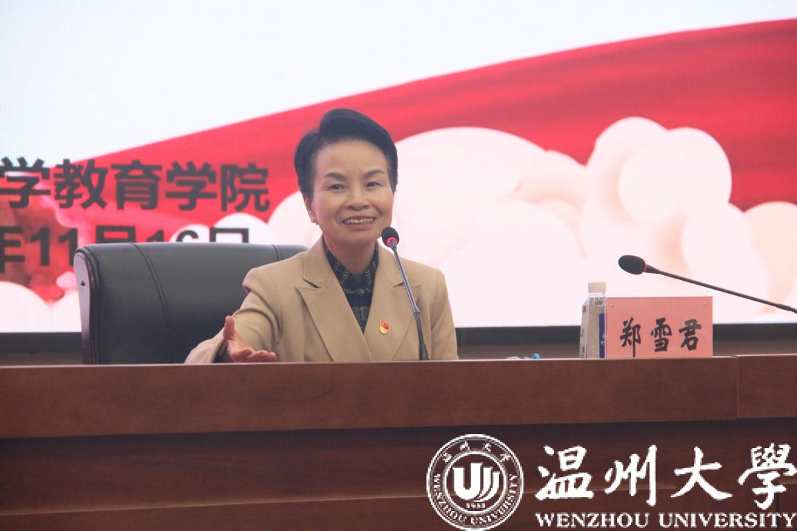 11月16日晚,温大教育学院在育英图书馆二楼报告厅开展主题为“明德致远爱先行,汲汲微茫润初心”的团干培训活动,特邀全国劳模、浙江省雪君理论宣讲名师工作室负责人郑雪君主讲《让心中的太阳升起》的励志课。全院团学骨干近270人参与。