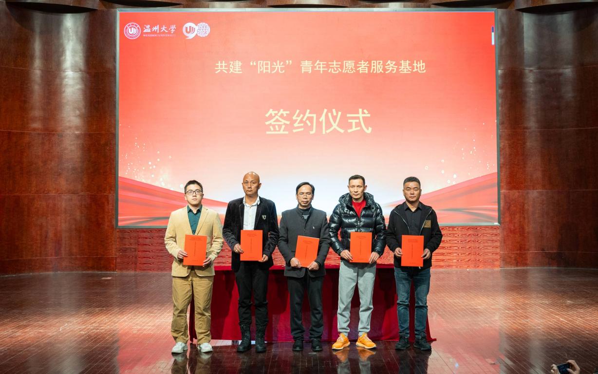 会上,“阳光”志愿服务团队指导师、浙江省“双带头人”教师、党支部书记何明昌教授,代表beat365官方网站数理学院与瓯海茶山街道山根社区、丽岙侨心养老院、康居乐养老院、温州福寿康公司签署共建“阳光”青年志愿者服务基地协议书。数理学院副院长蔡风景为上述四家服务单位授牌。章志图为数学、物理、统计、信算等四个专业的“阳光”志愿者分队授旗。师生通过敲鼓的形式共同启动“阳光”敬老服务月活动。