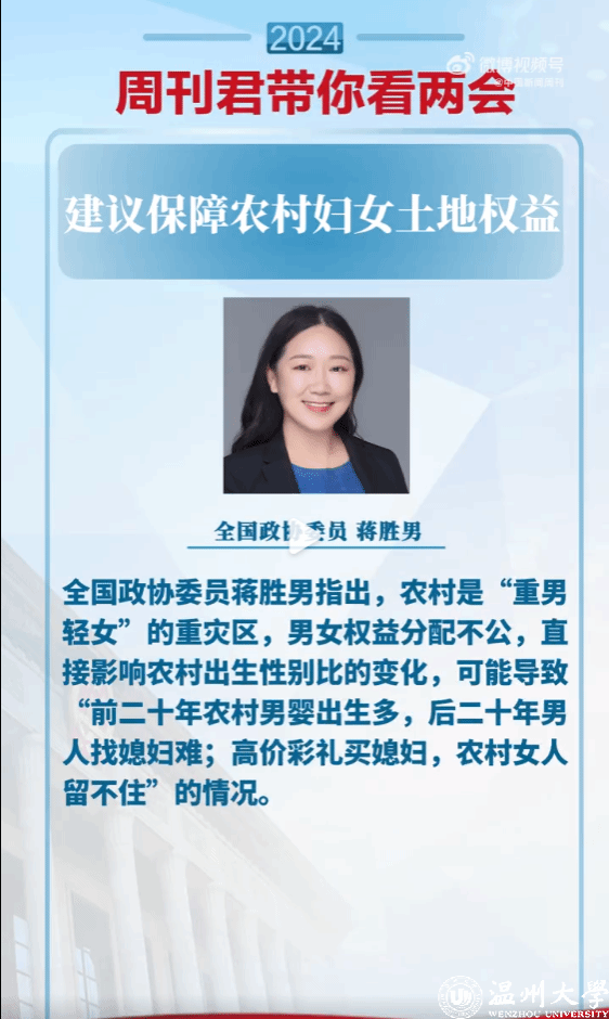 【蒋胜男委员:#建议保障农村妇女土地权益#】#建议确保农村妇女享有与男性平等的权利# 全国政协委员@蒋胜男 指出,农村是“重男轻女”的重灾区,男女权益分配不公,直接影响农村出生性别比的变化,可能导致“前二十年农村男婴出生多,后二十年男人找媳妇难;高价彩礼买媳妇,农村女人留不住”的情况。#周刊君带你看两会#