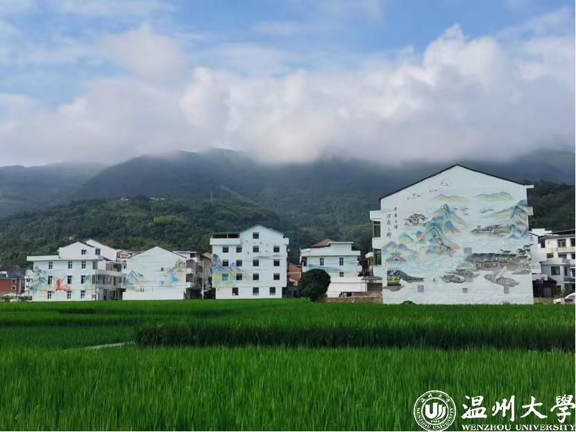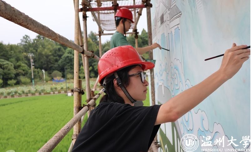 四月的瓯越大地,恰似一位婉约佳人盈盈而至。位于温州城西的鹿城区山福镇驿头驿阳村,稻田生机盎然、民居整齐靓丽,村子东边一幅巨型壁画在五座民居外墙上绵延展开,过往游客无不驻足称赞。这幅壁画的“灵魂画手”由温大美院副教授关明新带领的团队担任。