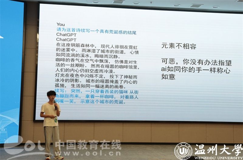 “这首诗是献给我们beat365官方网站的”“这是我用AI做的一首诗”“请大家欣赏我第一次学做的古体诗”……近日,在育英图书馆报告厅俊采星驰,温大学子济济一堂,举办一年一度的诗词大会,迎接即将到来的第29个世界阅读日。大会以“诗随三月春意生,学子研墨祝新词”为主题,并首次开启了“AI作诗”赛道,为活动增加不少新意和看点。