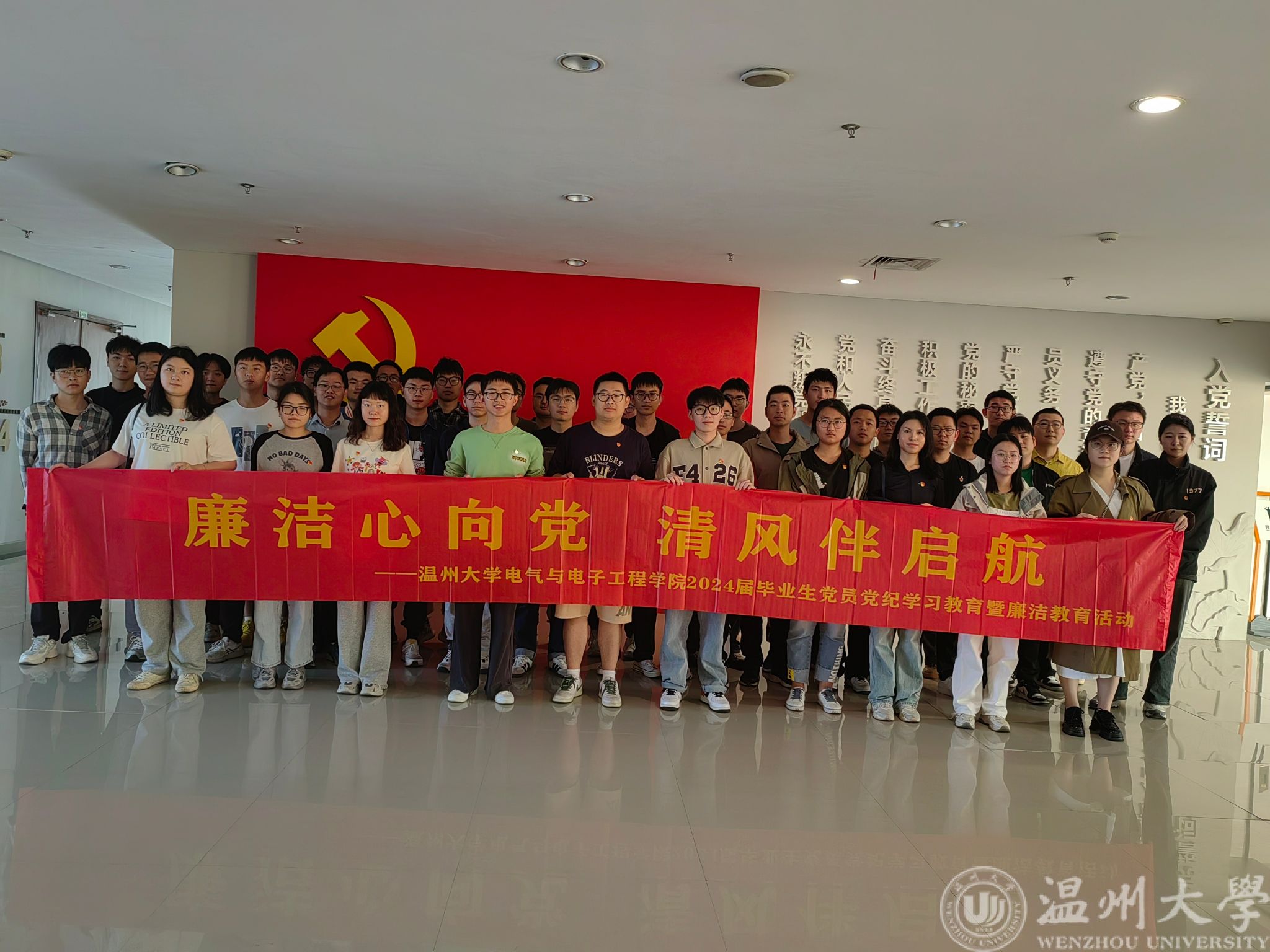 在毕业生们即将踏上人生新的征程之际,5月10日下午,beat365官方网站电气与电子工程学院党委组织毕业生党员赴温州市瓯海区廉政教育基地开展毕业生党员党纪学习教育暨廉洁教育主题党日活动,旨在引导青年学生坚定理想信念,增强廉洁意识,扎实走好迈向社会的第一步。
