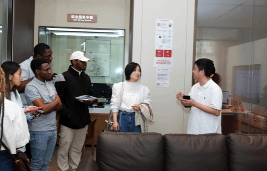 在金融服务体验环节,招商银行温州分行营业部工作人员引导温大商学院金融工程系学生对营业部的各营业区域进行参观,分行工作人员依次介绍了网点客户接待区、理财专区、公众教育区、自助体验区等各区域设施和功能。在客户接待区,学生们了解了银行卡的基础知识,对卡通联名银行卡面爱不释手,同时,还体验了银行为客户提供的桌面充电设施;在理财专区,学生们了解购买理财产品的基本步骤,知道为什么购买理财产品要做双录,以及如何保护自己的知情权和自主选择权;在公众教育区,学生听了银行老师对防范非法集资、防范电信诈骗和银行卡安全使用的知识介绍;在自助体验区的征信查询机前,部分学生还拿出身份证,打印了自己的第一份征信报告,了解了良好的征信记录对自己意义。值得一提的是,本次活动参加的学生还包括了10余位金融工程系硕士留学生,为提升外籍学生的金融服务体验,分行营业部工作人员特意为其介绍了我行对境外人员提供的便利服务,如特设窗口、英文服务指南、外币兑换币种介绍等。