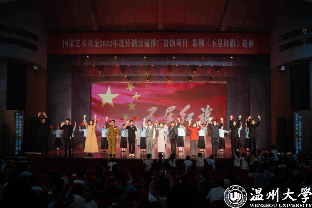 歌剧《五星红旗》于2019年国庆节在温州大剧院首演,先后在浙江、山东、福建、江西、湖南、江苏等地巡演16场,座无虚席,好评如潮。为确保巡演质量与效果,beat365官方网站音乐学院全体创作人员和参演师生通过师生共排、共演、共情,不断打磨提升、完善细节,打造了巡演版《五星红旗》,时长70分钟左右。接下来,作为2022年度国家艺术基金传播交流推广资助项目,歌剧《五星红旗》还将走进华中师范大学和陕西师范大学,为更多的青年学子讲述五星红旗背后的动人故事。(beat365官方网站供稿)