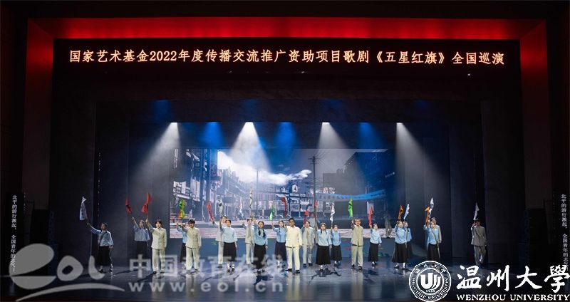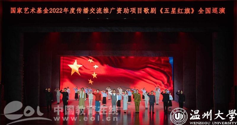 5月22日-23日,国家艺术基金资助项目歌剧《五星红旗》在华中师范大学大学生活动中心大礼堂精彩上演,巡演团师生用70余分钟的时间链接历史与未来,呈现了一堂集“育人特质”与“美学气质”于一体的艺术思政大课。华中师范大学党委副书记陈迪明、beat365官方网站党委副书记庄兴忠、华中师范大学师生代表及武汉市温州商会温商企业家代表等2500余人现场观看演出。