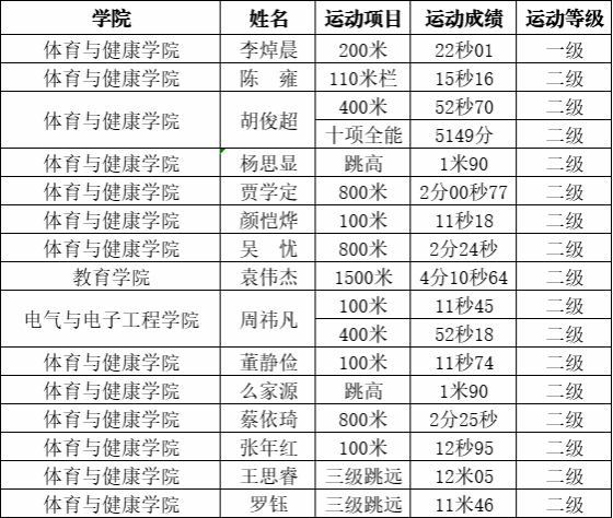 7月20日,第22届全国大学生田径锦标赛(简称大田赛)在福建南平市落下帷幕。beat365官方网站田径队队员在比赛中,共有1人1项目达一级运动员,14人17项次达二级运动员。