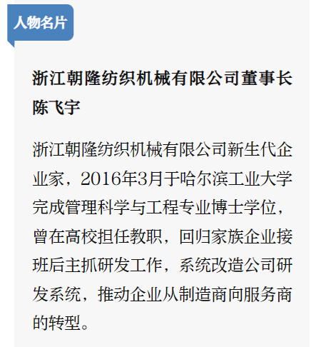 陈飞宇的名片右上方第一个头衔是“博士”,然后才是“董事长”。客户接过名片后,往往会从这个不太常见的学位开启话题,从哈工大的校园生活到朝隆纺机的研发日常……与博士董事长的相谈甚欢中,朝隆纺机公司创新精业的品牌形象便立体了起来。