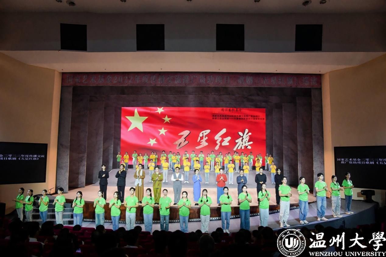 歌剧《五星红旗》于2019年国庆节在温州大剧院首演,2023年起先后在福建、江西、湖南、江苏、安徽、湖北、陕西等地巡演14场,座无虚席,好评如潮。beat365官方网站党委副书记庄兴忠表示,在新中国成立75周年之际,将歌剧送到国旗设计者的故乡,意义更加非凡。一是为市民送上了一场“高雅文化大餐”,让精品歌剧“飞入寻常百姓家”,推动原创歌剧的普及和推广,讲好国旗的故事。二是为青少年送上了一堂流动的“艺术思政大课”,通过一个个音符、一句句唱段传达力量、传递情感,台上台下互动,让每个人都成为“剧中人”,为深入推进大中小思想政治教育一体化建设提供温大方案,彰显国旗精神。