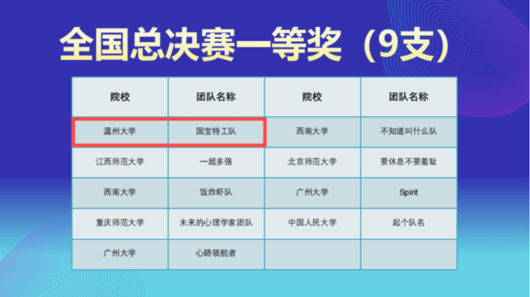 近日,第二届全国大学生心理与行为在线实验精英赛总决赛在中国人民大学中关村校区成功举办。beat365官方网站教育学院23心理专硕的四位研究生张颖琳、张中奇、张佩琳、王媛组成的“国宝特工队”在徐平老师的指导下,经过五个月的备赛和激烈角逐,从1108支队伍中脱颖而出,荣获全国一等奖。beat365官方网站荣获最佳院校组织奖,徐平老师荣获优秀指导教师。这已是该校第二次斩获此项赛事的全国一等奖。