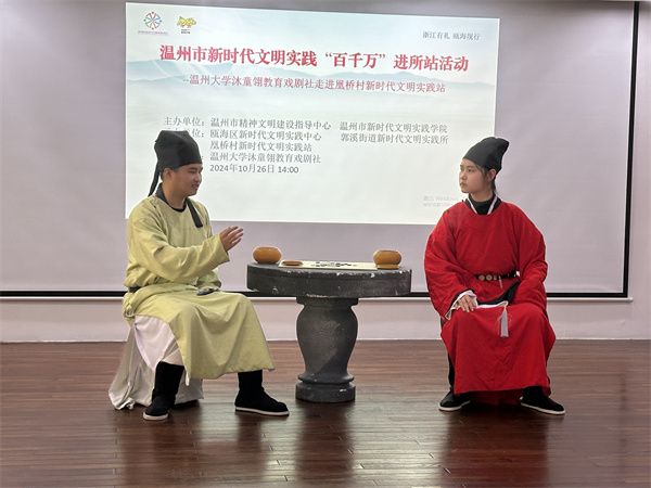 据悉,温大教育学院沐童翎教育戏剧团秉承师范教育传统,发挥学科专业优势,通过戏剧编创、制作和演出,多年来送戏进社区、进街道、进校园,是温大服务地方的生动诠释。几代社员精心打磨剧本,新生演员从台词磕巴到游刃有余,终将宋时雅韵再现于舞台。社团指导老师施星鸿表示,借助校地合作,学生通过戏剧表演和公益活动获得全面成长,又为当地村民展现传统文化的独特魅力,深化拓展新时代文明实践阵地建设。