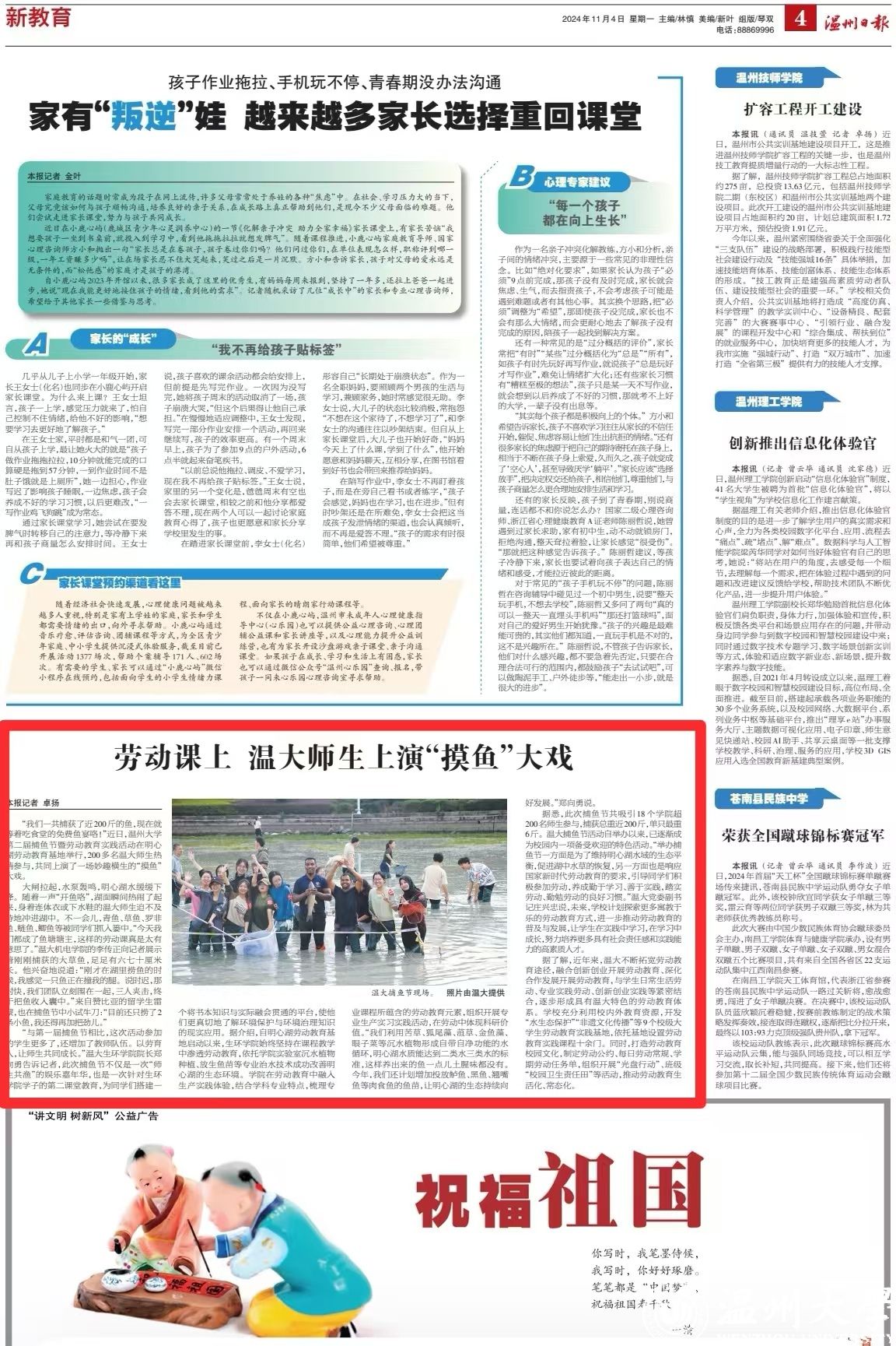 据了解,近年来,温大不断拓宽劳动教 育途径,融合创新创业开展劳动教育、深化 合作发展开展劳动教育,与学生日常生活劳 动、专业实践劳动、创新创业实践等紧密结 合,逐步形成具有温大特色的劳动教育体 系。学校充分利用校内外教育资源,开发 “水生态保护”“非遗文化传播”等9个校级大 学生劳动教育实践基地,依托基地设置劳动 教育实践课程十余门。同时,打造劳动教育 校园文化,制定劳动公约、每日劳动常规、学 期劳动任务单,组织开展“光盘行动”、班级 “校园卫生责任田”等活动,推动劳动教育生 活化、常态化。