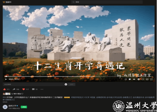 从温大广电出来的周洲淇,也想将自己的热爱继续分享下去。于是他找到了广电的台长,阐述了他的合作想法。通过ai视频的合作方式,共同创作出优质的视频,为温大宣传出一份绵薄之力。开学季,他们正式合作的第一个作品《十二生肖开学奇遇记》应运而生。令人欣喜的它刊登上了温大迎新推文的首页,让他们受宠若惊。同时也感受到深深的自豪——它证明了他们的aimv技术得到了学校的认可。看着诸多家长在视频号评论区的留言,他们感到充实和幸福。当然,一定要感谢谷雨院长和郑晓丽老师在他们创作期间的鼎力支持,两位亦师亦友的老师在视频制作和商业化逻辑中给了他们非常巨大的帮助,多次帮助他们调整方向,重振旗鼓。感谢谷雨院长和郑晓丽老师,他们给整个团队的尊尊教诲和鼓励,是团队坚持在这个赛道上最大的动力。