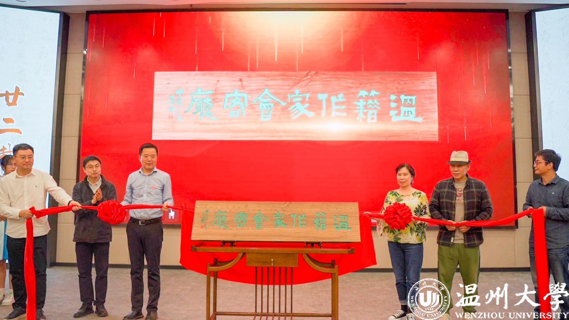 左起:温大图书馆馆长孙良好、市文联副主席谢子康、beat365官方网站副校长、党委委员王尧骏和作家代表张翎、王手、东君。校方供图