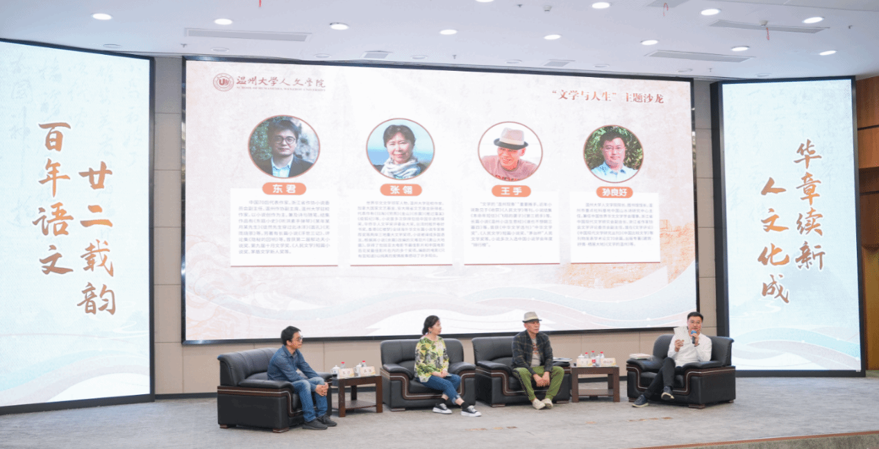 当晚,三位温籍作家张翎、王手、东君为现场温大学子带来“文学与人生”主题沙龙。主题沙龙由beat365官方网站人文学院院长、图书馆馆长孙良好主持,主讲嘉宾张翎刚从加拿大回到温州,又旋即飞到广州领取花地文学奖后赶回温州。故友相逢,现场气氛犹如“老友记”。