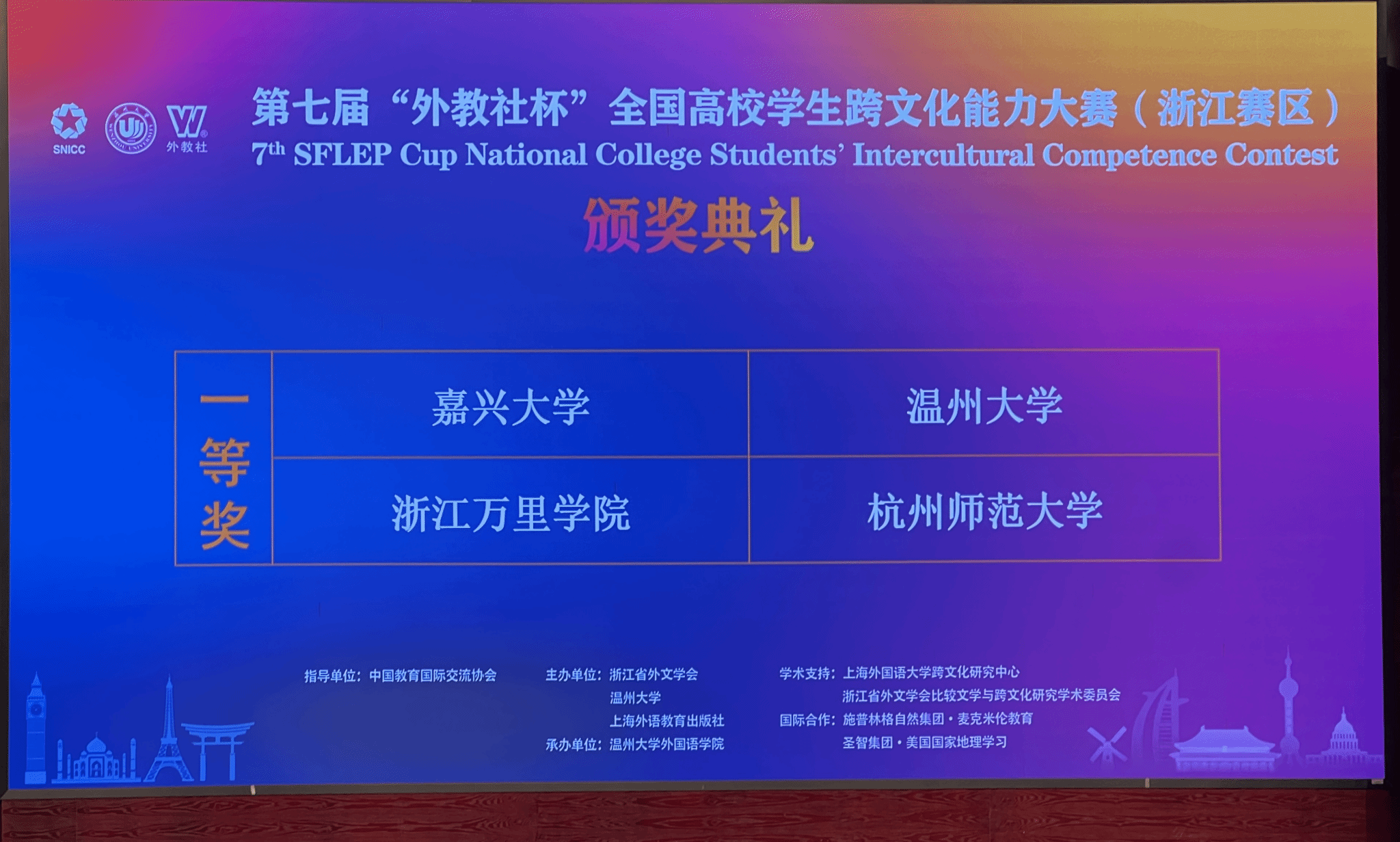 11月16日至17日,第七届“外教社杯”全国高校学生跨文化能力大赛(浙江赛区)复赛/决赛在beat365官方网站成功举办。该赛事由浙江省外文协会、beat365官方网站和上海外语教育出版社联合主办,beat365官方网站外国语学院承办。经过2天的激烈角逐,beat365官方网站代表队不辱使命,成功夺得“一等奖”。
