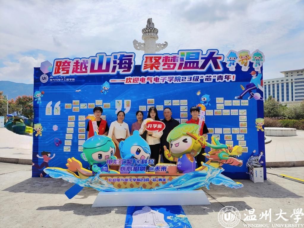 充满科技风的“充电赛道”,集芯片元素和电路图组成的科技之光“芯”青年愿望墙,彰显了电气电子学院电气工程及其自动化、电子科学技术和集成电路的专业特色,与学院培养新时代科技创新人才的方向不谋而合;而特别定制的龙舟造型,呼应了温州作为第19届杭州亚运会龙舟主场地,展示了温州中国龙舟文化之乡的深厚底蕴。昂首向前的龙舟上载着杭州亚运会的吉祥物琮琮、宸宸、莲莲,他们蓄势待发,寓意着青年学子朝气勃勃、精神焕发。