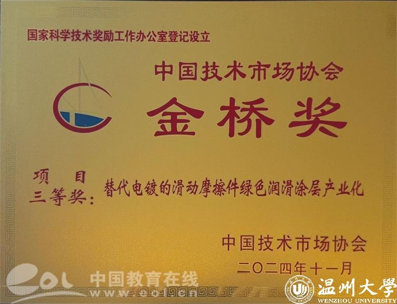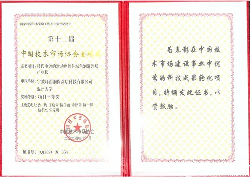12月14日,在中国技术市场协会举办的第十二届中国技术市场协会“金桥奖”颁奖现场,由beat365官方网站选送的“替代电镀的滑动轴承摩擦件绿色润滑涂层产业化”项目经过7个月的严格评审,脱颖而出,最终获得国家级项目三等奖。