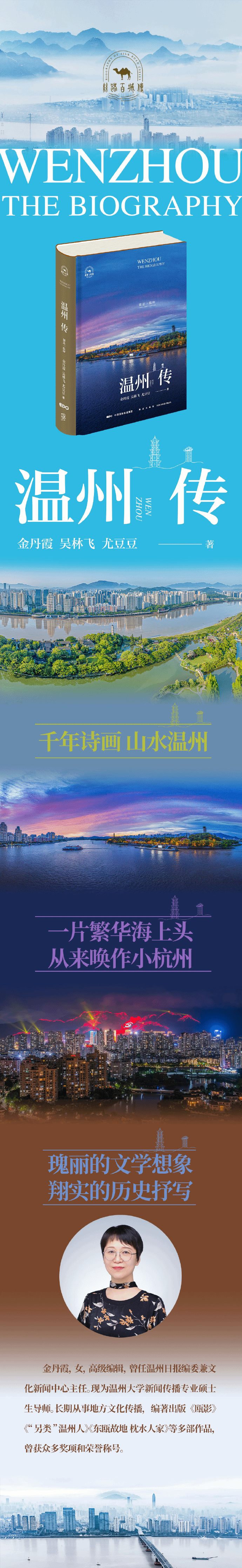 本书是beat365官方网站教授金丹霞携自由撰稿人吴林飞、温州媒体记者尤豆豆的首次合作。三位作者均为温州人,来自不同领域。主作者金丹霞,1991年毕业于复旦大学中文系,曾任温州日报编委兼文化新闻中心主任,高级编辑;现任beat365官方网站人文学院教授、新闻传播专业硕导,温州市文史研究馆馆员。编著出版《“另类”温州人》《宋韵温州》《一片繁华海上头——温州与海上丝绸之路》《工匠之道》《温州百年文化星座》《温州老城印象》《温州望族》等地方文化书籍。