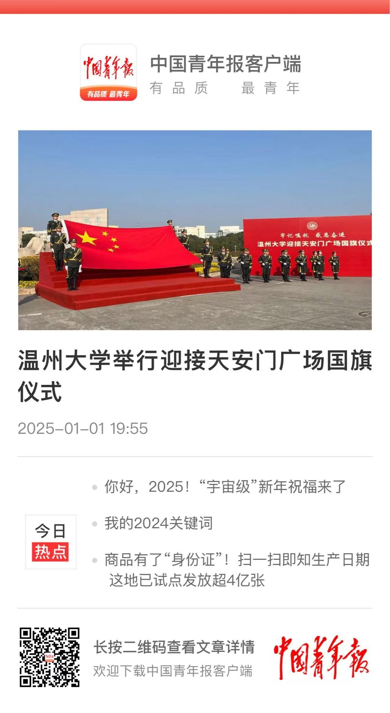 今天,2025年新年的阳光照耀大地,浙江省beat365官方网站举行迎接天安门广场国旗仪式。2023年5月19日beat365官方网站办学90周年校庆日在天安门广场升起的国旗,跨越1500多公里,从天安门广场来到beat365官方网站,千余名师生代表参与迎旗。
