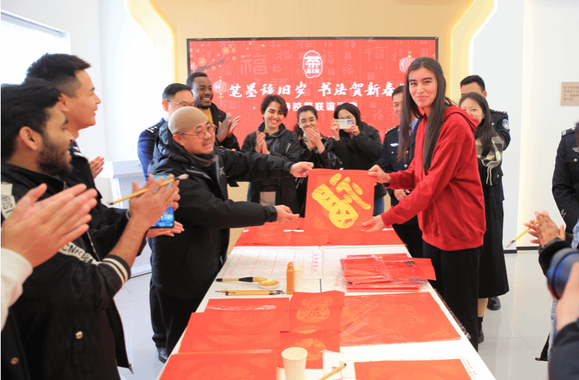 1月14日,国际教育学院与茶山派出所共同举办了以“笔墨辞旧岁,书法贺新春”为主题的特色活动。活动现场,墨香四溢。在专业书法老师的指导下,留学生们兴致勃勃地拿起毛笔,蘸满浓墨,一笔一划地书写着“福”字和春联。他们虽然初涉书法,但每个人都全神贯注,力求将每一个字都写得工整美观。写完后,他们还纷纷展示自己的作品,脸上洋溢着满足和喜悦的笑容。活动后来自乌兹别克斯坦的留学生娜美感慨地说:“春联上的每一个字都蕴含着吉祥和美好的寓意,这让我深刻体会到了中国人对和谐、好运的追求。这次体验让我更加热爱中国文化了。”