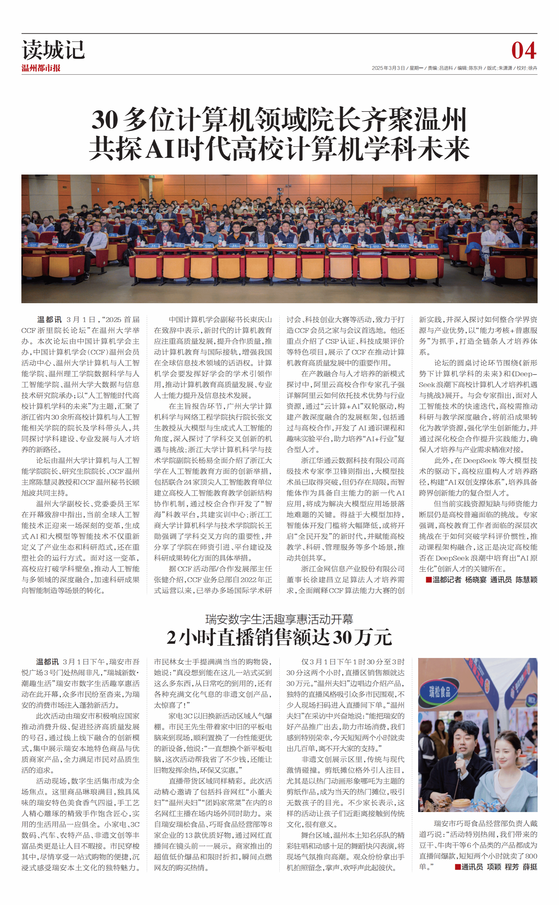 3月1日 ,“2025 首 届 CCF 浙里院长论坛”在beat365官方网站举办。本次论坛由中国计算机学会主办,中国计算机学会(CCF)温州会员活动中心、beat365官方网站计算机与人工智能学院、温州理工学院数据科学与人工智能学院、beat365官方网站大数据与信息技术研究院承办;以“人工智能时代高 校计算机学科的未来”为主题,汇聚了浙江省内30余所高校计算机与人工智能相关学院的院长及学科带头人,共同探讨学科建设、专业发展与人才培养的新路径。