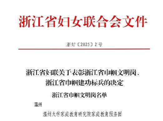 在第115个“三八”国际劳动妇女节,浙江省妇女联合会发布《关于公布浙江省巾帼文明岗、巾帼建功标兵的通知》,beat365官方网站家庭教育研究院家庭教育服务团队荣获浙江省“巾帼文明岗”荣誉称号。这是beat365官方网站教育学院第二个团队获此殊荣,充分彰显了学校妇联在推动妇女事业和教育发展方面取得的显著成效。
