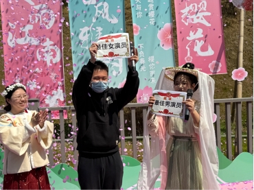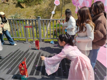 活动伊始,樱花园内衣袂翩跹,数十名青年志愿者身着曲裾深衣、齐胸襦裙等传统汉服,以“行走的历史画卷”之姿开启文化盛宴。广袖流云间,古韵与新风交织,青年学子化身传统文化使者,带领观众穿梭千年时空,在沉浸式体验中触摸华夏衣冠文明的璀璨光华。“趣味答题”以文会友,从汉服“交领右衽”的形制智慧到“十二章纹”的礼制深意,参与者透过趣味互动解码服饰中的文明密码;“投壶竞技”再现周礼雅趣,箭矢破空声中诠释“发而不中,反求诸己”的君子之风;“不倒森林”协作挑战则以现代游戏激活古籍《礼记》中“和而不同”的哲学智慧。活动现场欢声笑语不断,传统文化不再是书本上的抽象符号,而是化作可触可感的鲜活体验,青年一代在团队协作与文化解码中,悄然完成对“何以中国”的精神叩问。