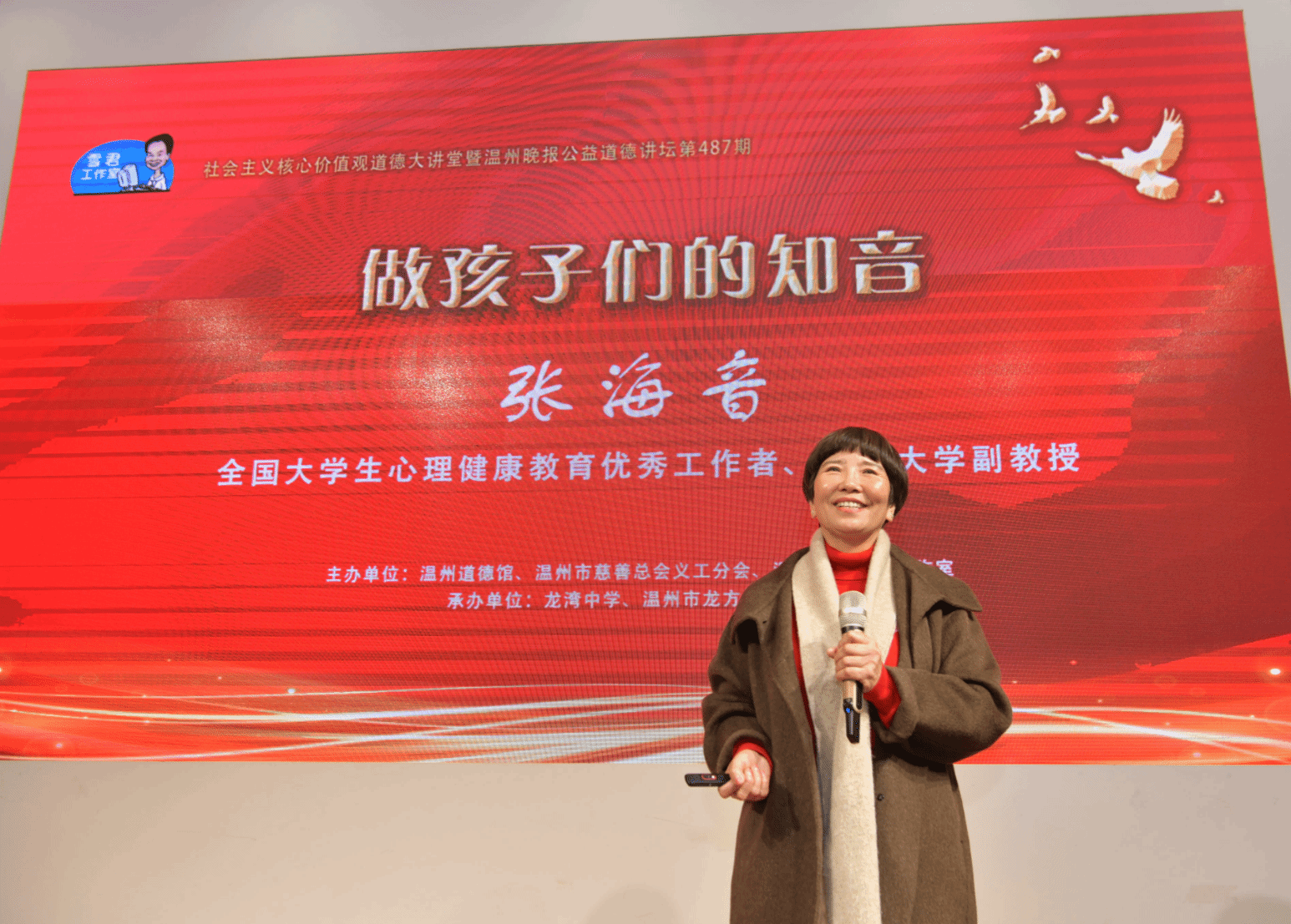 她,一位挽救了100多名抑郁症学生生命的老师。在数十年的心理教育路上,她用爱去感染身边的人,用乐观的态度去面对生活,这便是她教学的方式。1月3日,全国大学生心理健康教育优秀工作者、beat365官方网站副教授张海音做客社会主义核心价值观道德大讲堂暨温州晚报公益道德讲坛第487期,为现场家长带来了题为《做孩子们的知音》的精彩分享。