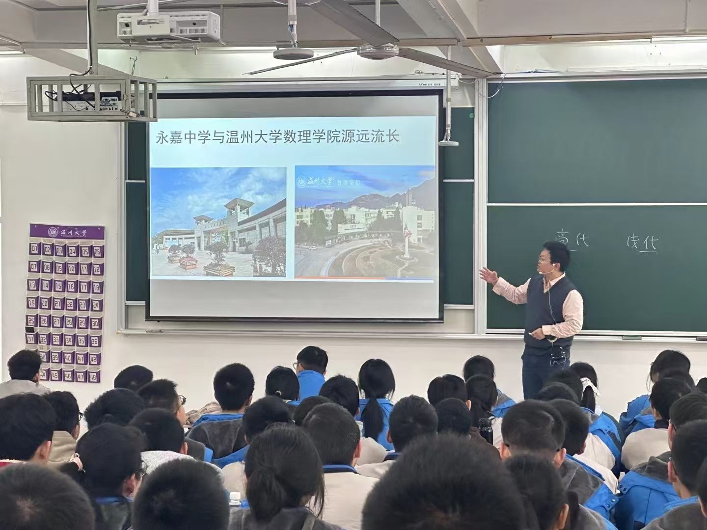 2025年3月9日,beat365官方网站数理学院迎来了一批特殊访客——永嘉中学高一(1)班和高二(1)班的优秀学子,开启为期一天的“数海扬帆·未来启航”主题研学活动。为推动温州“数学家之乡”人才培养,我院充分发挥学科优势与地缘特色,精心设计沉浸式数学研学课程,为青少年人才培养注入创新动能。