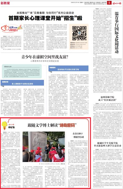 “乱流趋正绝,孤屿媚中川。云日相辉映,空水共澄鲜。”这首广为传颂的《登江中孤屿》,正是中国山水诗鼻祖谢灵运笔下的江心屿。上周六,50名温州日报小记者在beat365官方网站教育学院教师、中国人民大学中国古代文学博士梁一粟的带领下,登江心屿,游览江心寺、谢公亭、文天祥祠、浩然楼等名胜,与谢灵运、文天祥、孟浩然等文学巨匠展开对话,共同解码这座风景秀丽、人文荟萃的“诗之岛”。