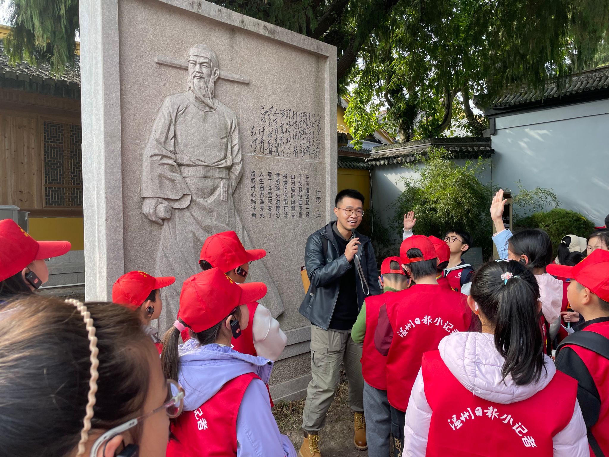 “当谢灵运离开晋都城金陵,南下永嘉郡城赴任太守的时候,他面对的是被贬的失意和仕途不明朗的境遇。”相传在孤屿西山下有一古亭,是谢氏常观江景之处,后称“谢公亭”。谢公亭前,梁一粟为小记者逐句“拆解”《登江中孤屿》背后的故事,“‘表灵物莫赏,蕴真谁为传’,表面上是谢灵运感叹江心屿空有美景却无人传写的遗憾,其实他也将自己比作美景,以双关寓意无人欣赏的情绪。”“不愧是山水诗鼻祖,把水天一色、清澈鲜丽的景色写得美轮美奂。”小记者庄皓宇说。