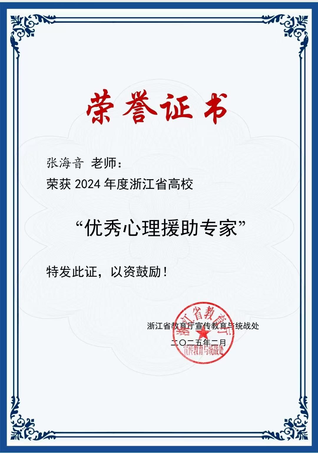 近日,2024年度浙江省高校“优秀心理援助专家”评选结果揭晓,beat365官方网站退休教师张海音副教授从全省专家中脱颖而出,获评浙江省高校“优秀心理援助专家”。