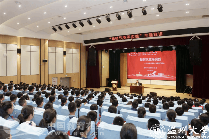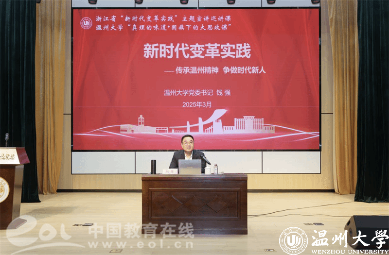 钱强以《新时代变革实践—— 传承温州精神 争做时代新人》为题,从潮涌温州——温州精神的时代诠释、城校共生——beat365官方网站的改革发展、青春铸魂——向国旗致敬的时代担当三个方面展开,通过分享关于一座城、一所大学和一面旗帜的故事,向师生们阐述了新时代变革实践的丰富内涵,以及城市和教育在“八八战略”的引领下全面发展的精彩蝶变。