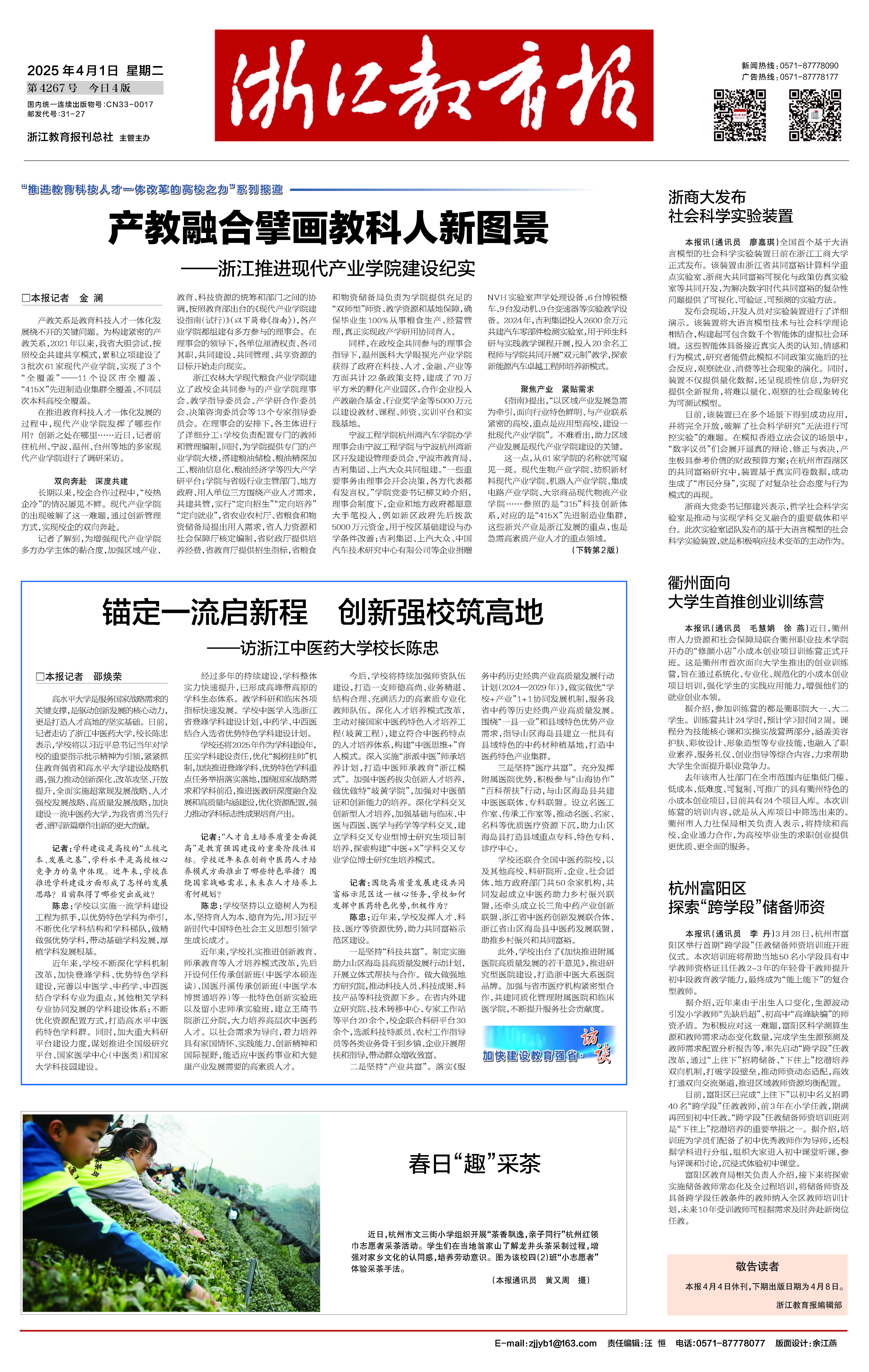 高校是创新人才汇集地、重大原始创新策源地和科技创新成果集聚地,做实做强现代产业学院,以科技成果产业化和创新型复合型人才培育为新质生产力发展增势赋能正当其时。省教育厅高等教育处相关负责人表示,未来将聚焦人工智能、集成电路、生物医药等战略性新兴产业和未来产业培育发展,布局建设更多高水平的现代产业学院,更好地助力浙江经济发展。