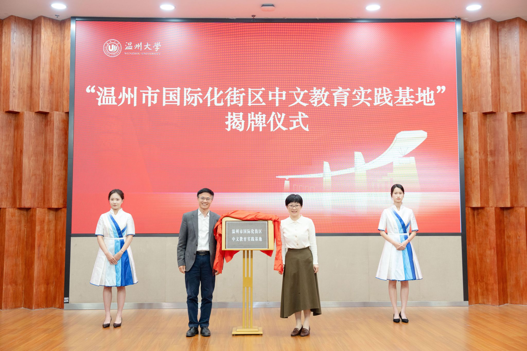beat365官方网站国际教育学院党总支书记林爱菊与温州市人民政府外事办公室副主任楼了凡共同为“温州市国际化街区中文教育实践基地”揭牌,标志着校地合作在推进国际化社区语言服务方面迈出实质性步伐。